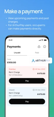 ودّع القلق بشأن المواعيد النهائية للمدفوعات؛ فمع "Arthur"، يمكنك الاطلاع فورًا على جميع الفواتير المستحقة وتواريخ استحقاقها بوضوح تام، مما يساعدك على إدارة ميزانيتك بفعالية. وفي حال واجهت أي تحديات أو احتجت إلى صيانة، يتيح لك "Arthur" تقديم البلاغات بكل سهولة ومتابعة تقدمها خطوة بخطوة داخل التطبيق، لتبقى على اطلاع دائم بحالة طلبك حتى يتم حلّه.